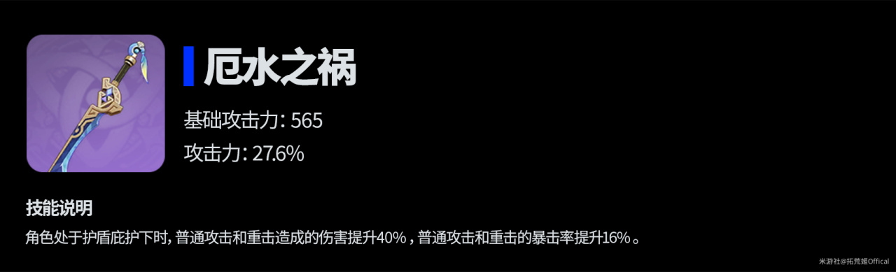 说明:在队伍中有冰水盾辅角色的情况下可以使用,接近全覆盖的40%增伤与16%暴击,特效十分优秀且本身是活动白嫖武器,是四星中的优选(不搭配盾辅则不考虑)。