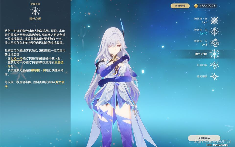 触发除融化外的冰元素相关反应后会生成一枚虚境裂隙,存在2.5scd,且至多同时存在3个。短按战技后的重击、元素爆发或长按战技的状态都能吸取虚境裂隙,每吸取一枚虚境裂隙可以获取8点蛇之狡谋。