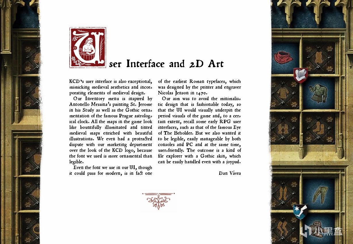 《天国拯救》的用户界面也非常出色,是最早的罗马字体之一,模仿并融合了中世纪美学,它由印刷师和雕刻家尼古拉斯于1470年设计。我们的库存菜单受到安东内洛·梅西纳的画作《耶柔米在书房》以及著名的布拉格天文钟的哥特式装饰启发,游戏中的所有地图看起来都像是丰富照明和染色的中世纪地图,装饰着美丽的插图。