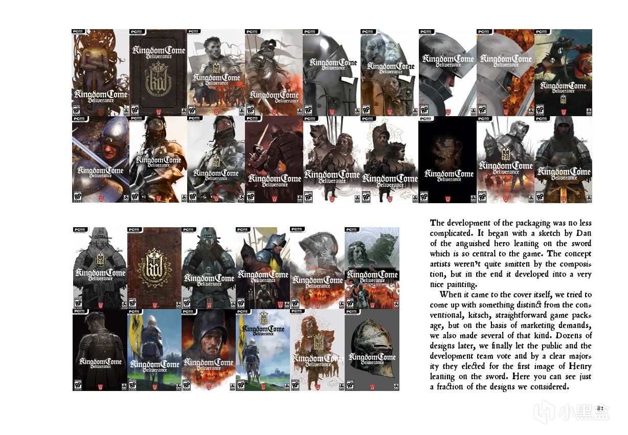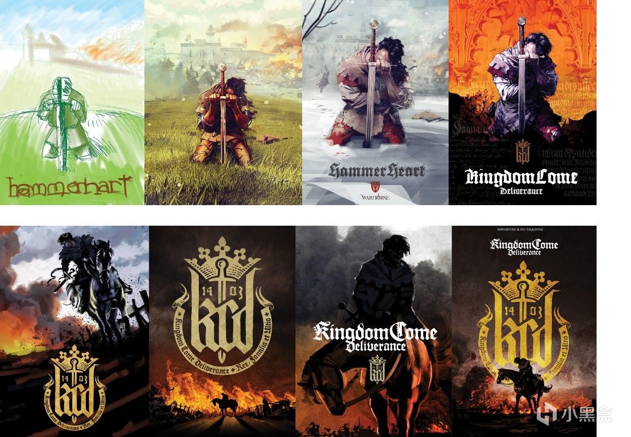 关于游戏封面本身,我们尝试设计一些与传统、庸俗、直接的游戏包装截然不同的东西,但基于市场需求,我们也制作了几种那样的设计。在数十个设计方案之后,我们最终让公众和开发团队投票,结果以明显的多数选出了亨利倚靠剑的第一张图片。在这里,你可以看到我们考虑过的部分设计。