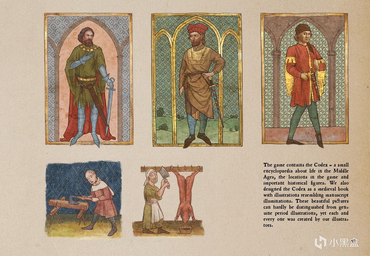 游戏包含了《密码法典》——一本关于中世纪生活、游戏场景和重要历史人物的小百科全书。我们还将《密码法典》设计成一本中世纪风格的书籍,配有类似手稿插图的插图。这些美丽的图片几乎让人无法与历史上真正的画作看出区别,它们每一幅都是由我们的插画师创作的。
