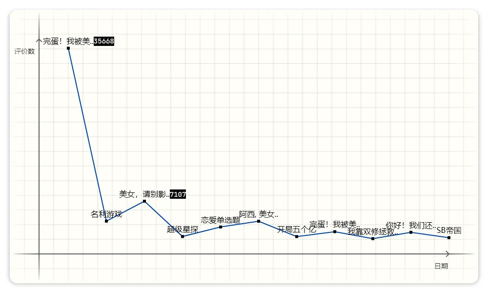 一个非常典型的案例就是2023年爆火的独立游戏《完蛋,我被美女包围了》,实际上2024年就有了众多仿制的作品,比如《恋爱单选题》《名利游戏》《美女,请别影响我学习》《开局五个亿》等等,我统计了部分作品以及它们在Steam商店的评论数量(数据截至2025年3月17日),得到下图: