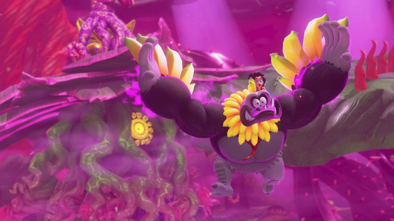 當這對不太可能的搭檔探索地下世界時,寶琳可以通過歌聲增強咚奇剛的破壞能力,甚至讓他暫時變形。收集黃金可以積累"香蕉能量",讓寶琳的歌聲激活變形,每種變形都有其特殊能力。比如"金剛狂歡"讓DK變得超級強壯,"斑馬狂歡"讓他速度更快並能短距離衝刺,"鴕鳥狂歡"則允許咚奇剛飛行並向敵人投擲"蛋彈"。