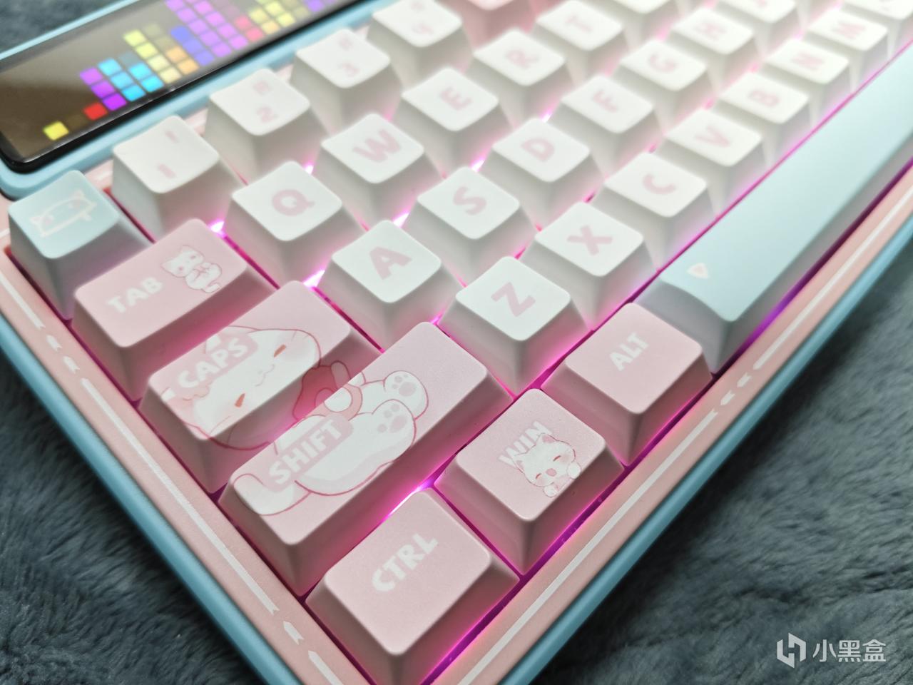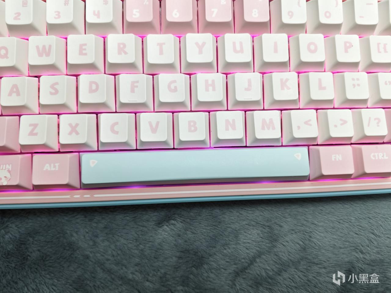 我手中这把是轻羽轴的粉喵星语,键盘触感圆润,敲击声有缓冲声音很小,不会像青轴之类的噼里啪啦的扰民,完全不用为了怕打扰别人而捏着鼻子敲薄膜键盘了。