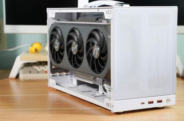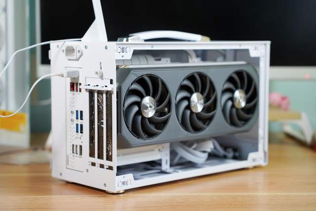 在将机箱后部的拆下后,安装了显卡。由于机箱设计的缘故,显卡单独位于另外一侧,这就有了足够的空间,可以容纳长显卡。当然,要使用显卡延长线,这是用的是超频三的支持PCIe 4.0的显卡延长线。这款机箱支持长达340mm的长显卡,三槽显卡可达65mm,在ITX机箱里属于少见的了。尽管如此,我还是忽略了显卡的厚度,这款索泰5070Ti 显卡的厚度高达67.5mm,比普通的三槽还要厚,因此属于恰恰好的能放进来。