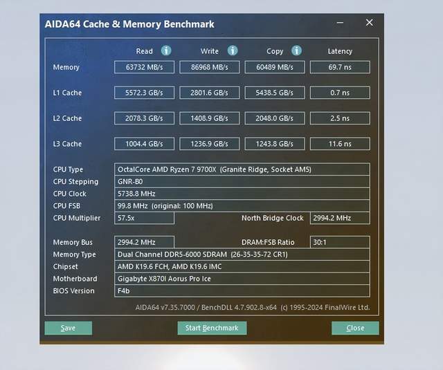 AIDA64内存测试,读取63732MB/s,写入86968MB/s,复制60489MB/s,延迟69.7ns。读写提升,延迟大幅下降。