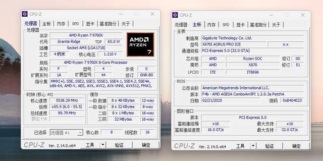 运行CPU-Z,正确识别CPU和主板。CPU R7 9700X,主板X870I AORUS PRO ICE,通道规格PCI-Express 5.0。