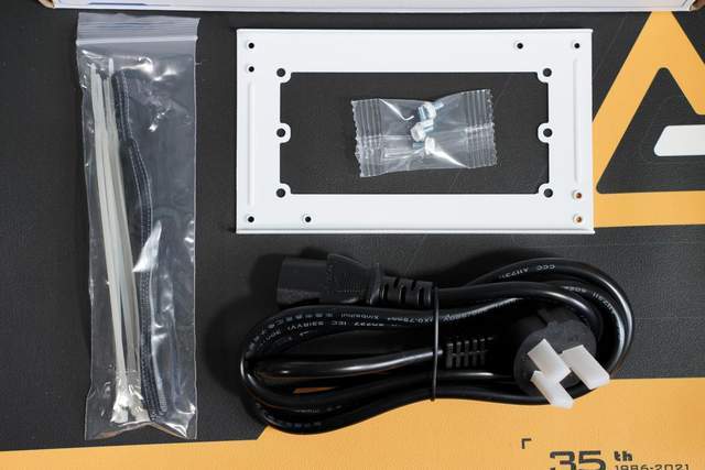 它的配件齐全,除了电源线还有捆扎带、一个转换挡板、四颗螺丝。
