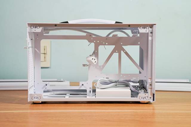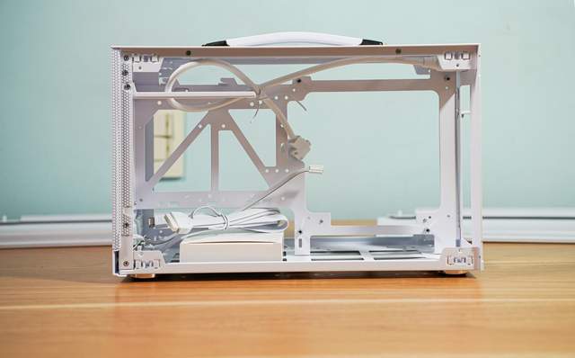 这里是右侧面看,中间的架子将机箱分为了两侧。这一侧右面是主板位置,左侧是电源位置。机箱支持SFX电源。前面板引出线有3根分别是USB-A、USB-C和电源按钮和电源状态。一根电源引线从后部延顶部延伸到前面。