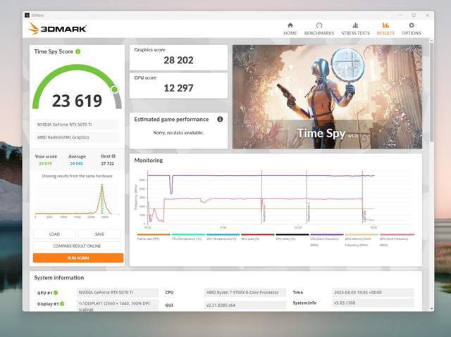 3DMARK Time Spy,总分23619,其中图形得分28202,CPU得分12297。