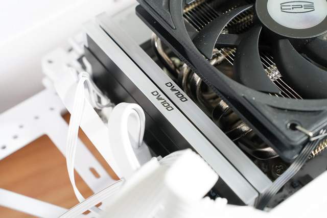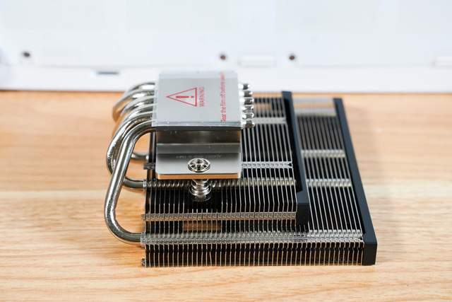 将这款风冷散热器压到CPU上面安装好,可以看得见顶部鳍片有2个镂空的地方,下面这里就是扣具螺丝,可用螺丝刀穿过鳍片安装固定。