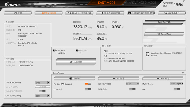 我们进入这款技嘉主板的BIOS界面,看到默认的简易模式。在中间有产品的各种参数和状态显示。而在左侧和右侧则是可以进行各种一键设置,从而提升系统性能表现。比如在左侧可以将Memory内存启用XMP或者EXPO超频,以及启用XMP/EXPO高带宽,可以一键提升性能。