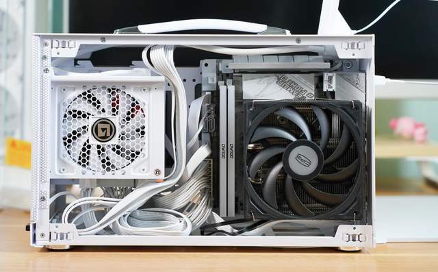 将电源安装到机箱内后,可看出的确是非常小巧,比起风扇还要小。