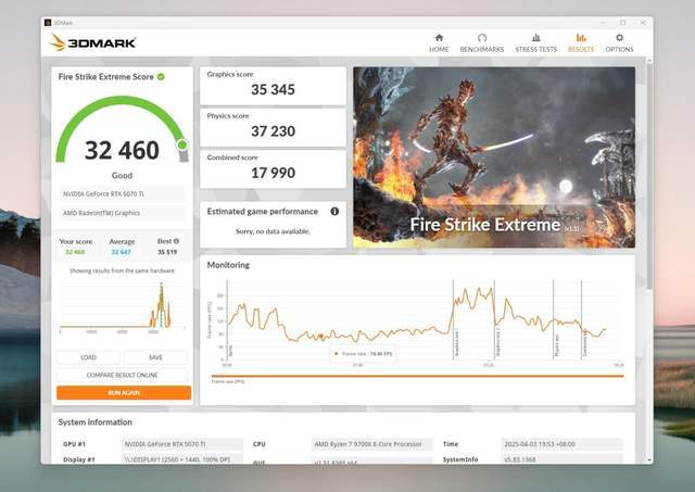 3DMARK Fire Strike Extreme测试,总分32460,图形得分35345,物理得分37230,综合得分17990。