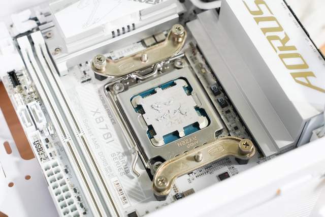 取出主板,白色ICE系列一贯的全白色风格,在各家的白色电脑主板中白色化最为完全的非ICE系列莫属。一体式IO上面AORUS的字样分外醒目,从板子底色到内存槽、端子、按钮等等均是白色的。不仅好看,主板品质也很强大。它采用了8+2+1相供电设计,高达110A 供电晶体管,10层服务器级低阻抗2盎司铜PCB板,优质电感电容用料,使用顶级的AMD CPU也毫无问题。