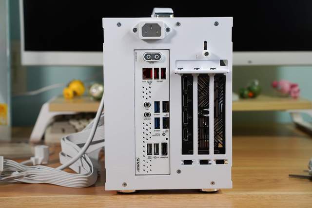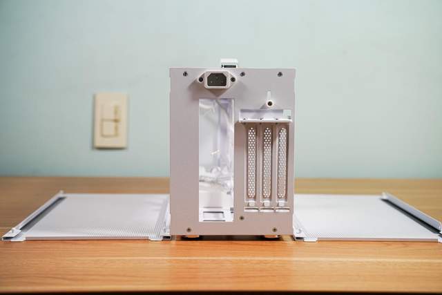 侧板是卡扣式快拆快装的,所以可以轻松取下。从背部可以看出有3个PCIE槽,后面是一个电源线接口。空的是主板IO接口位置。