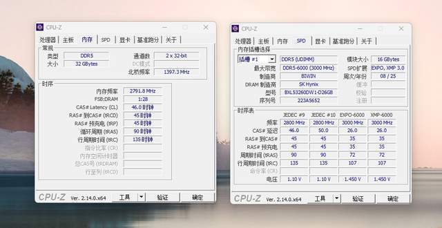 内存页面,我们看默频是5600MHz,时序46-45-45-90。支持XMP和EXPO超频到6000MHz,时序26-35-35-72,超低时序。