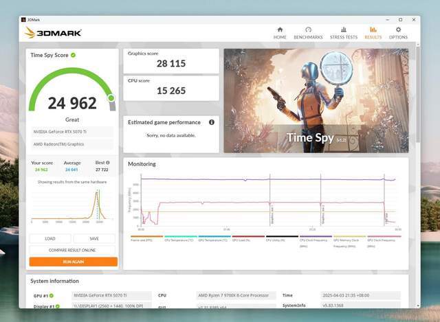 3DMARK Time Spy测试,总分24962,其中图形得分28115,CPU得分15265。