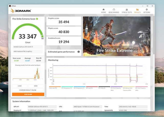 3DMARK Fire Strike Extreme测试,总分33347,其中图形得分35494,物理得分40830,综合得分19294,比起之前同样是物理得分有提升。
