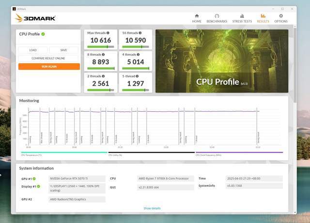 3DMARK CPU Profile测试,单线程1297,多线程10616,多线程比起之前提升了。