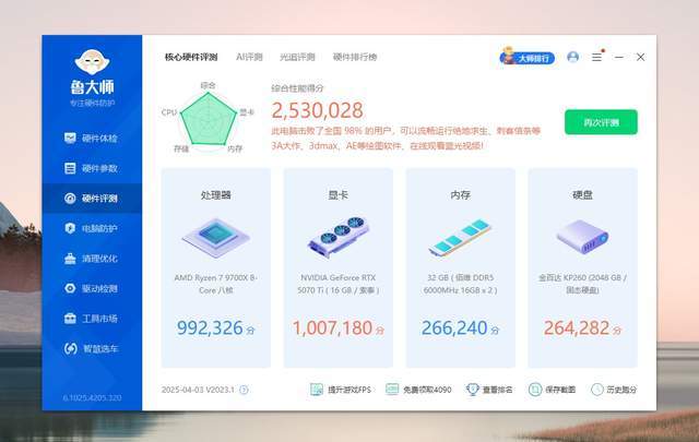 运行鲁大师,配置显示CPU是AMD R7 9700X,内存是佰维DDR5 6000MHz。显卡是索泰RTX 5070Ti,主板是技嘉X870I AORUS PRO ICE。