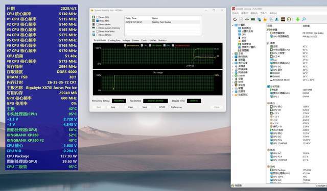 AIDA64 FPU压力测试,128W,达到了95°温度墙。毕竟是小机箱,散热还有有些压力的。根据我们的经验,在机箱底部增加一个进风风扇,可以大幅提升散热效果。