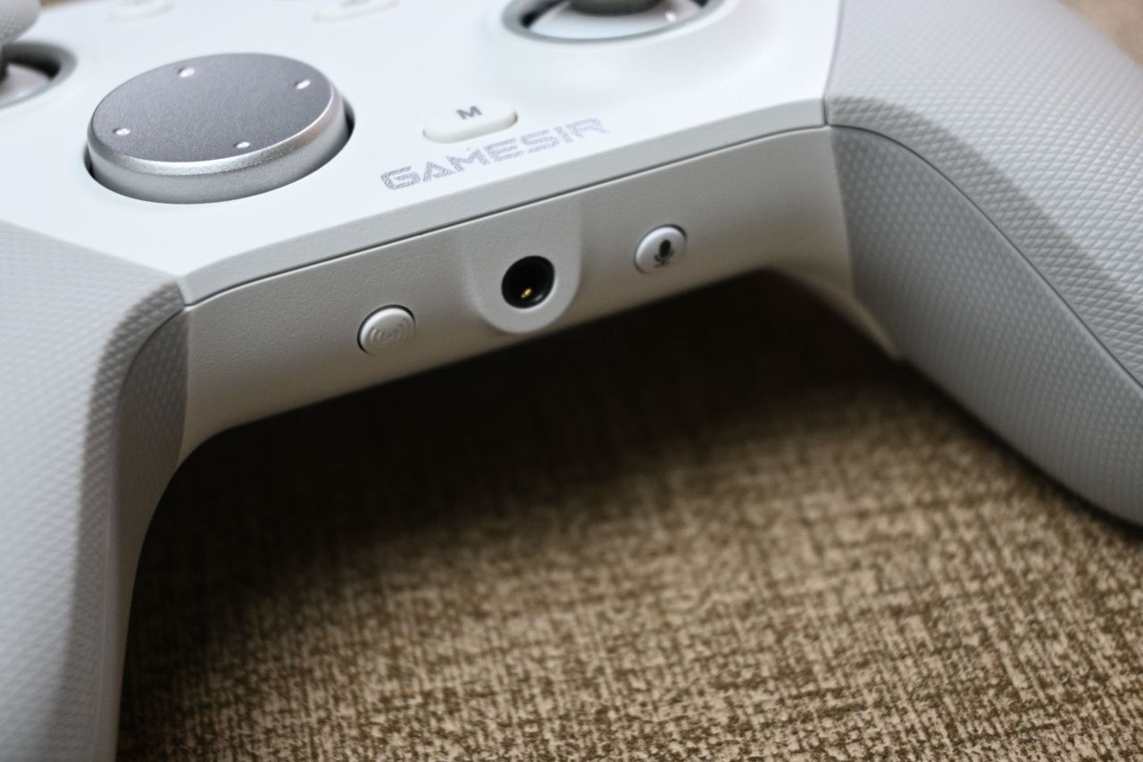 手柄底部设有一个先进的3.5毫米接口,这个耳机口支持无线音频,能在无线模式下连接有线耳机,对于外接耳机党来说是非常实用的功能。耳机口左侧为手柄的配对键,右侧则是闭麦键。