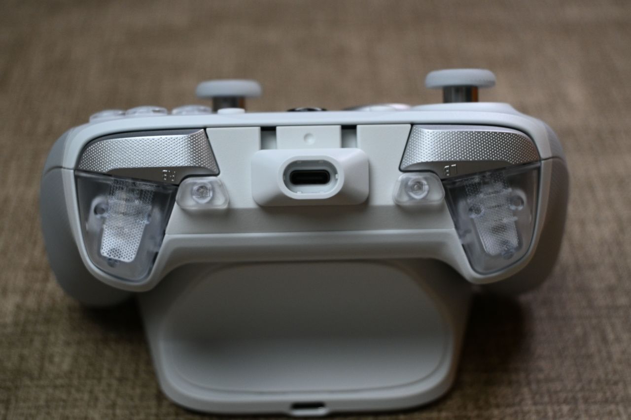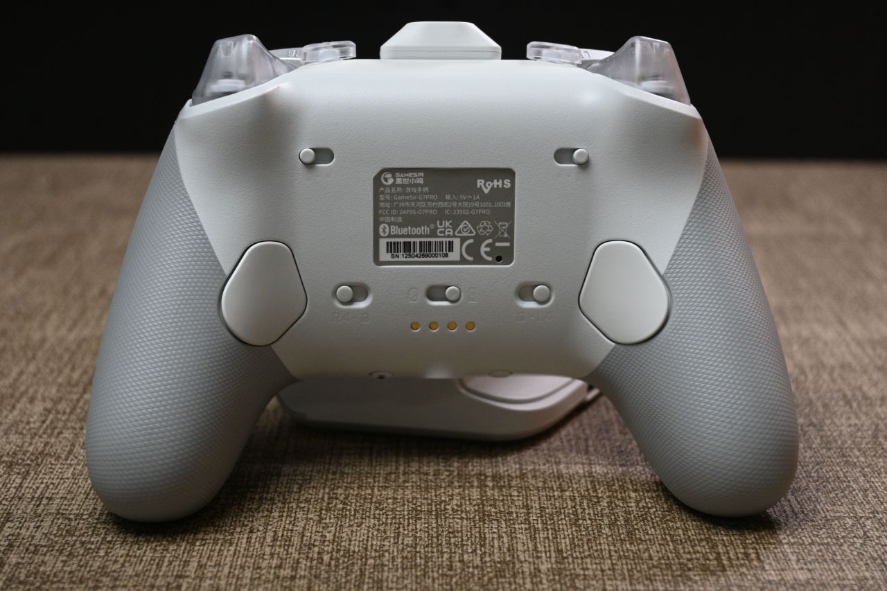 手柄背部设计非常干净,他的螺丝孔为隐藏式设计,观感很不错。手柄设有两颗轻触开关大背键,背键位置安排合理,中指能够轻松触发。且它设有背键锁,开启之后,背键变为不可触发。不过可惜的是,他并没有像九尾狐那样可回缩。居中位置则是手柄的蓝牙/2.4g切换开关跟无线底座的金属触点。上方位置是手柄的双切开关。