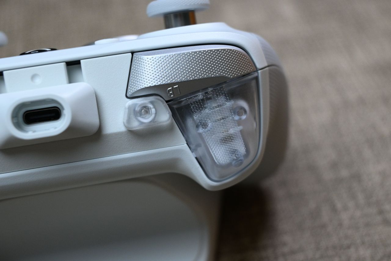 手柄的肩键为轻触开关按键,按键手感一致性不错,触发快速。扳机内侧位置还有两个微动开关拓展肩键,两个按键很小巧,但是触发非常轻松,普通握之下,勾过去就能轻松触发。扳机为双切方案,通过背部的切换开关,能在256阶霍尔线性扳机及1mm的微动扳机中快速切换。
