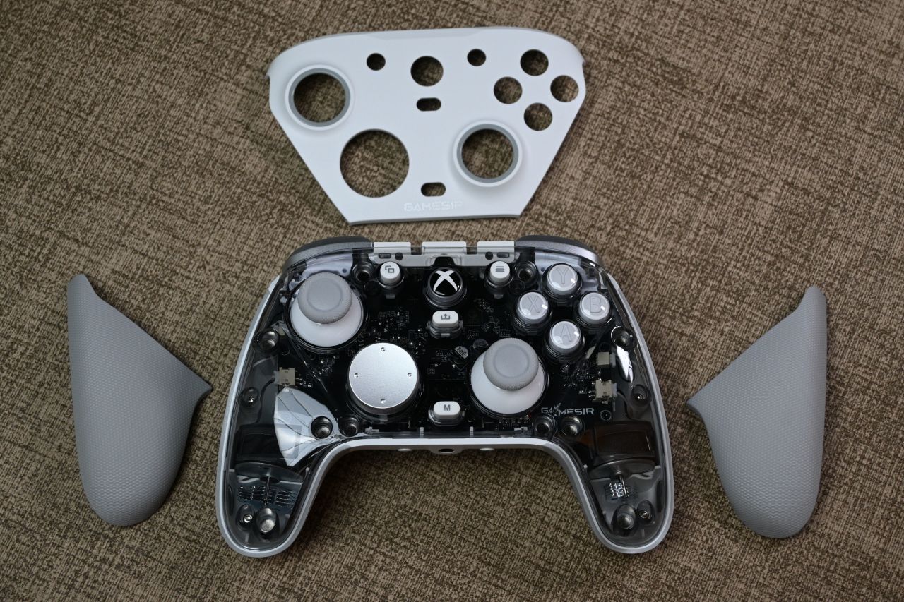 手柄面壳及正面握把盖均为可拆卸设计,内面板为透明度极高的PC材质,能看到手柄内部的用料及做工,赛博感很强。他的磁吸方案非常完善,边缘位置做的都非常严丝合缝,如果不提握把可拆卸,估计有很多小伙伴都没有发现。不过目前还有一点改进空间,我收到的这款手柄握把盖板的圆弧位置稍稍有点突出(大概0.01mm左右),会有一点点刮蹭感。当然,这有点凤毛求疵了,毕竟这个部分不是握持区,实际使用并不会影响手感。磁吸面盖的最大优势还是在于强大的DIY可玩性,我个人是非常迫切官方或者第三方能够尽快推出替换面壳的。