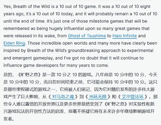 在前段時間,IGN發佈了“曠野之息NS2版本”的評測文章並表示:“是的,《曠野之息》是一款10分遊戲。八年前它是10分,今天它依然是10分,而且它可能直到永遠都會是10分。”