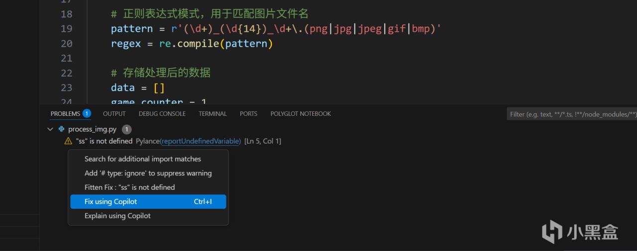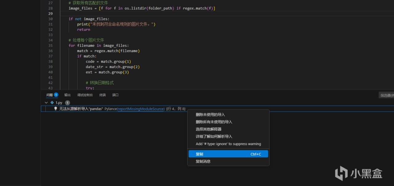 代码报错是写程序绕不开的话题,遇到问题时下面的 问题 栏会显示报错的信息,我们只需要 右击 复制给 AI 即可,让 AI 修改代码。