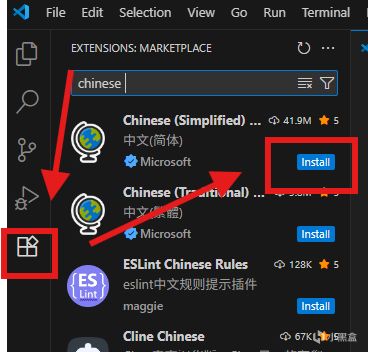 如下图,左边这一栏选拓展图标,搜 Chinese 安装