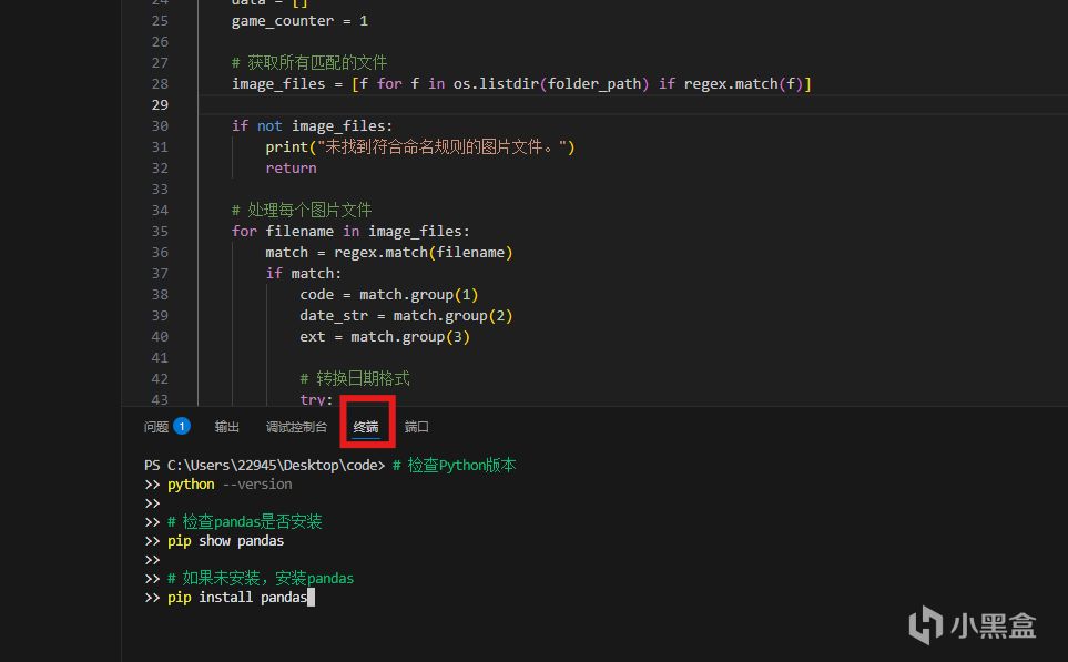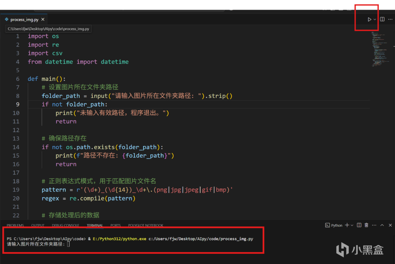 点击右上角运行,看到下面的终端【终端 快捷键ctrl + shift + `(键盘左上角 esc 下面的那个键)】提示我们输入图片的文件夹路径。