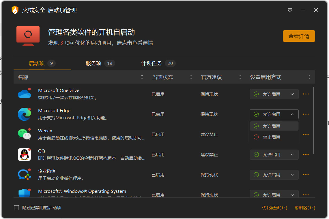 此外,火絨有很多適合萌新的功能,比如開機自啓動項管理,可以批量操作,關閉那些不必要的自啓動,減少系統的後臺佔用: