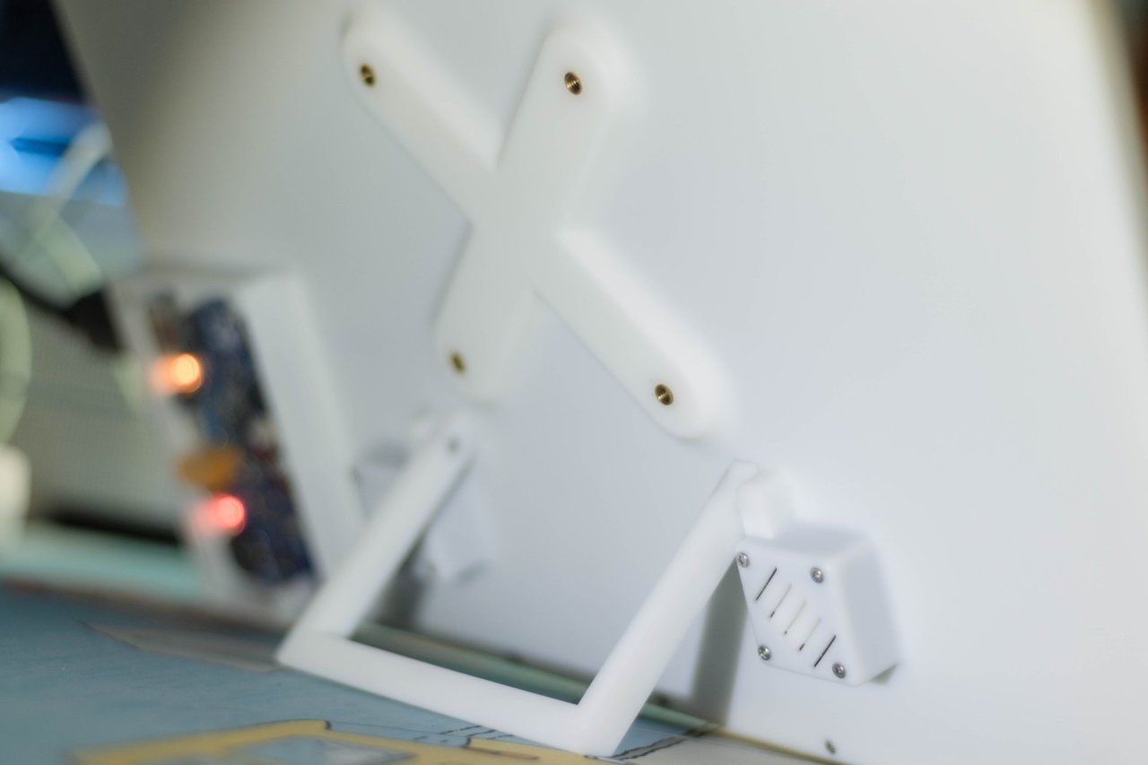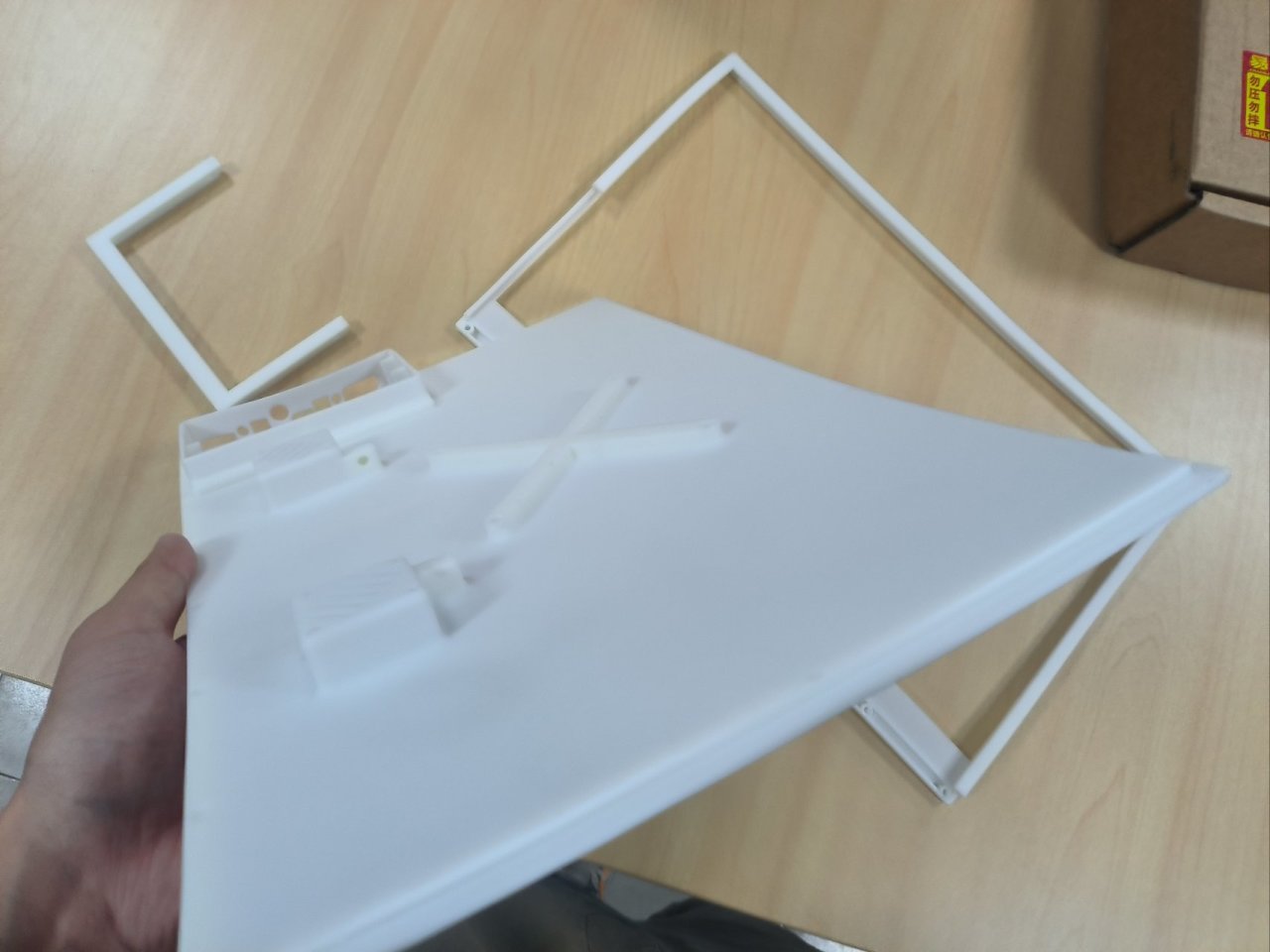 外壳属于又薄又大的模型,3D打印碍于工艺的问题,很容易出现残余应力的问题,整块外壳刚到的时候,完全没法用,整个就是弯曲的。只能使用外力给他一个反方向的挠度,勉强校正一下。