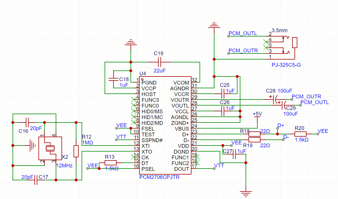 我躺在床上玩,自然是需要一些带感的bgm的,所以加入了一个音频的功能。用的是c口输入音频,芯片是PCM2706(一片7块钱,贵的落泪),PCM2706既能DAC直接输出,也可以输出I2S。