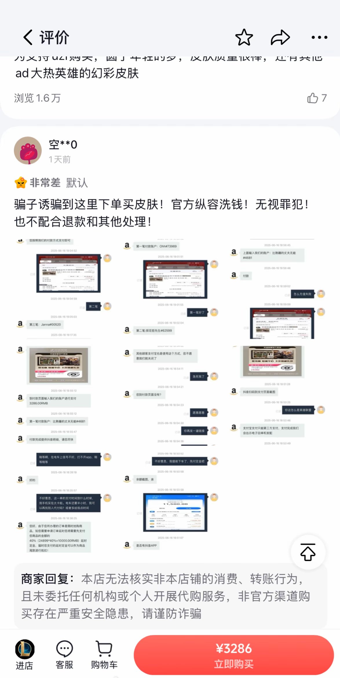 至于集美后续差评uzi皮肤,认为这个英雄联盟官方是和诈骗团队一伙的,我就不做评价了,估计也想通过这种手段把钱追回来,至于过程人家根本不在乎。