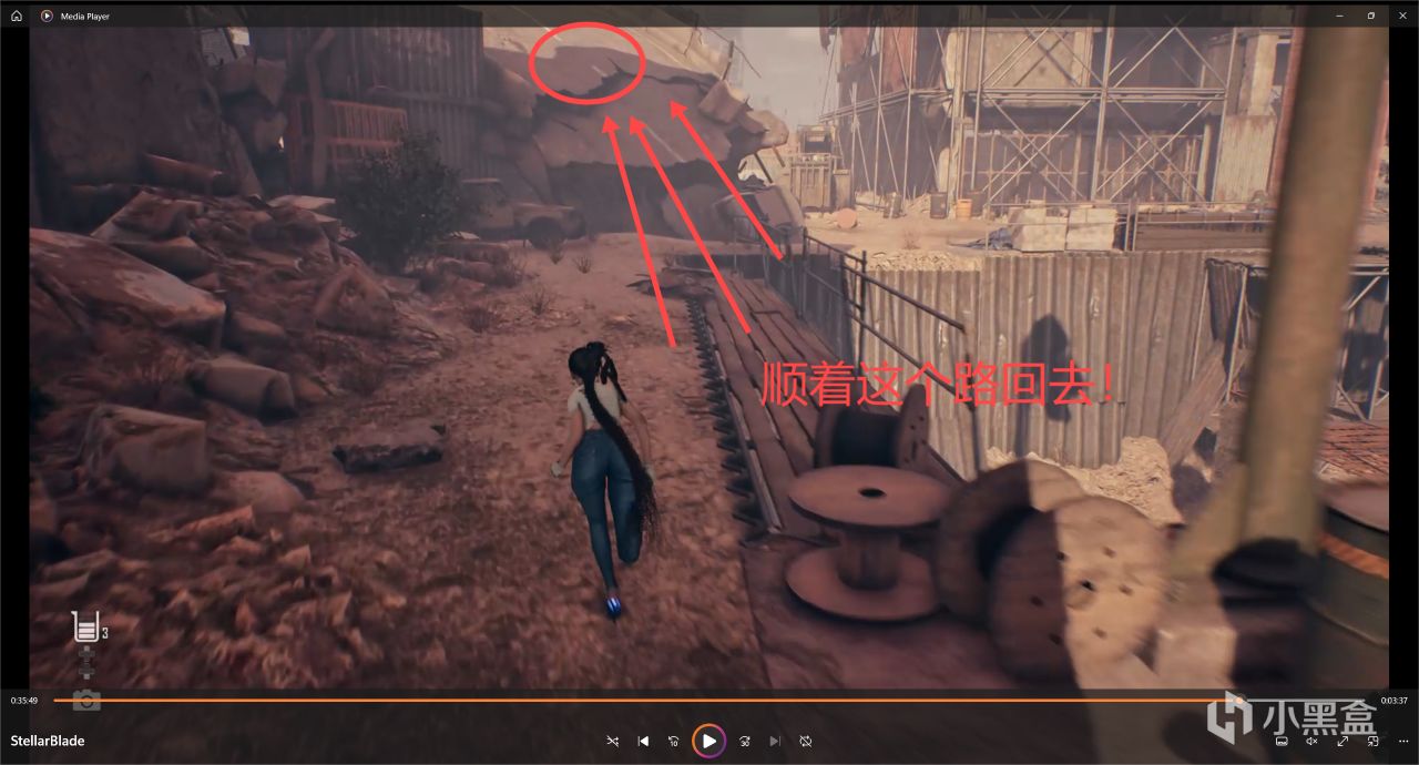 然後我們沿着剛剛拿完寶箱的旁邊的坍塌的路,一直往上走!
