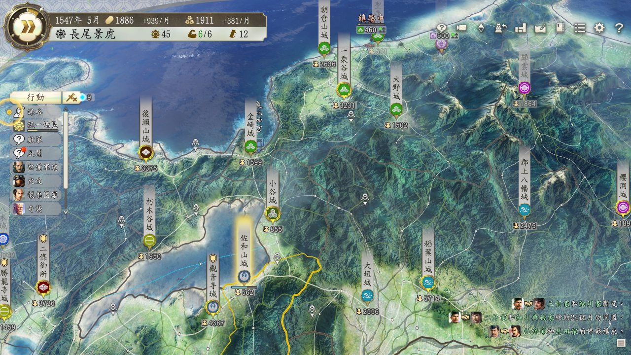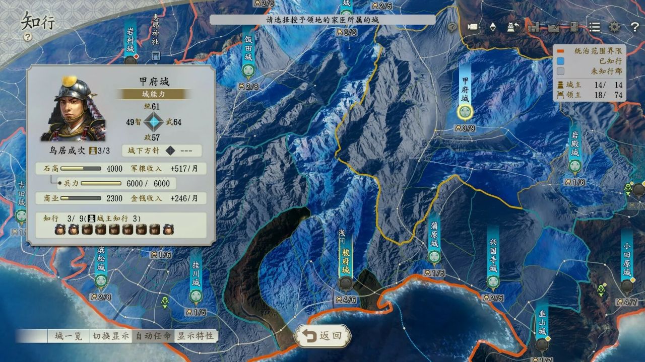 不過在我們介紹這個遊戲的核心魅力之前,容我贅言幾句基本玩法和框架: 《新生》作爲系列40週年紀念作,其核心突破在於重構了統治模擬的交互邏輯。其實現手段就是遊戲主打的“知行”系統,將織田信長天下布武的野心轉化爲可操作的權力網絡——這其實就是放權給分封將領以避免終端操作的系統,大名不再直接操控每一寸土地,而是通過分封家臣發展郡縣,屬於城主系統的補充。玩家需權衡武將能力與忠誠度,將城池與郡縣作爲知行地委派給家臣管理;這或許是一個早應有之的機制設計,畢竟這是實際反饋戰國逐級分封的金字塔形權力結構特質的,但是直到這代的技術發展足以承擔這套現代化改進之後才和我們見面。