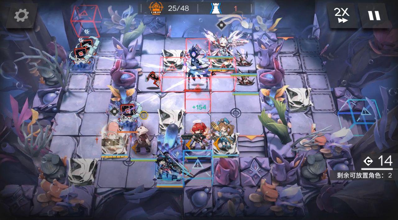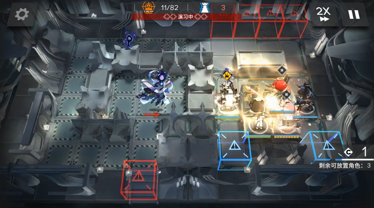依次部署能天使朝左开技能,蕾谬安朝上开技能挂机。本关蕾谬安2技能打的慢会导致自己残血,练度低的推荐带3技能,可以立刻轰炸敌方。