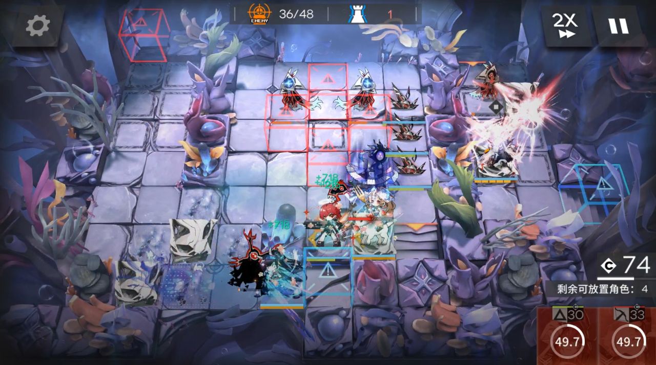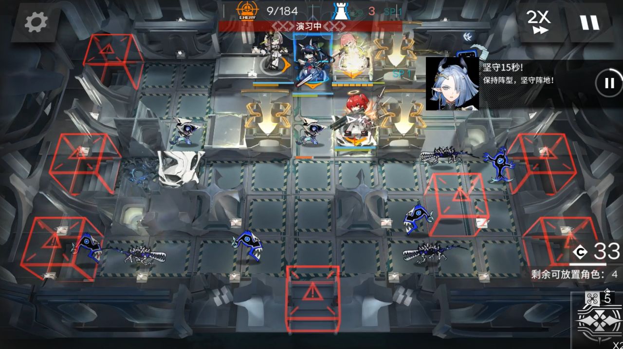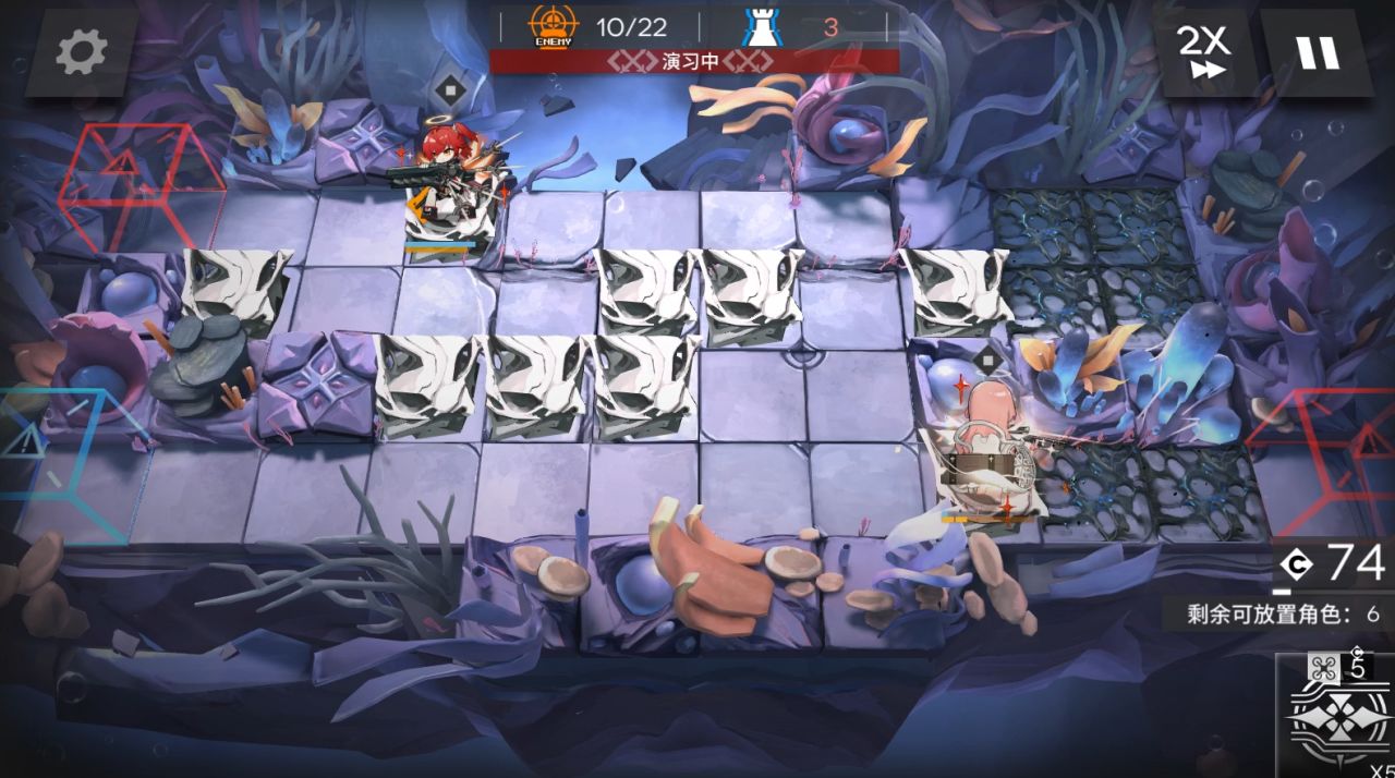 依次部署煌朝左,askl朝左,能天使朝左,EW朝右,等能天使那边方块的怪来了开技能,能天使后面技能好了就开。同时开EW技能。然后奶羊朝左,蕾谬安朝上开技能挂机,蕾谬安可以放下面一个高台,这里会挂。EW右边打完撤退了