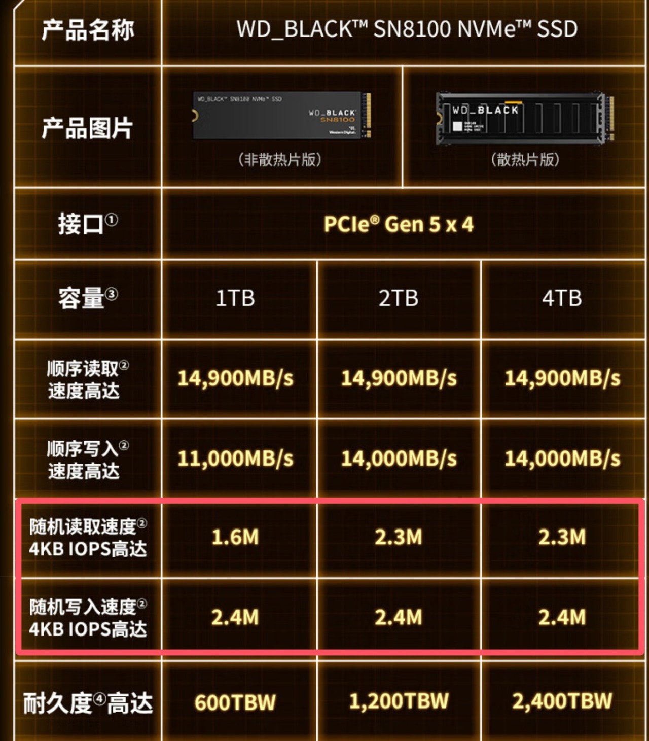 但这里有个问题,就是最大随机4K读取速度(IOPS)和最大随机4K写入速度(IOPS)的部分,别的品牌都是标个2000K、1600K,SN8100它直接来了个2.3M和2.4M,按照我的理解,M应该代表的是百万吧,那么数据应该是2300000和2400000,按照主流显示规格应该是2300K和2400K,为什么不能换成主流显示的规格来方便用户进行对比?还有一个问题就是,自营店的标价为4999,但是官方旗舰店的价格是3333.34,不知为什么差异这么大。