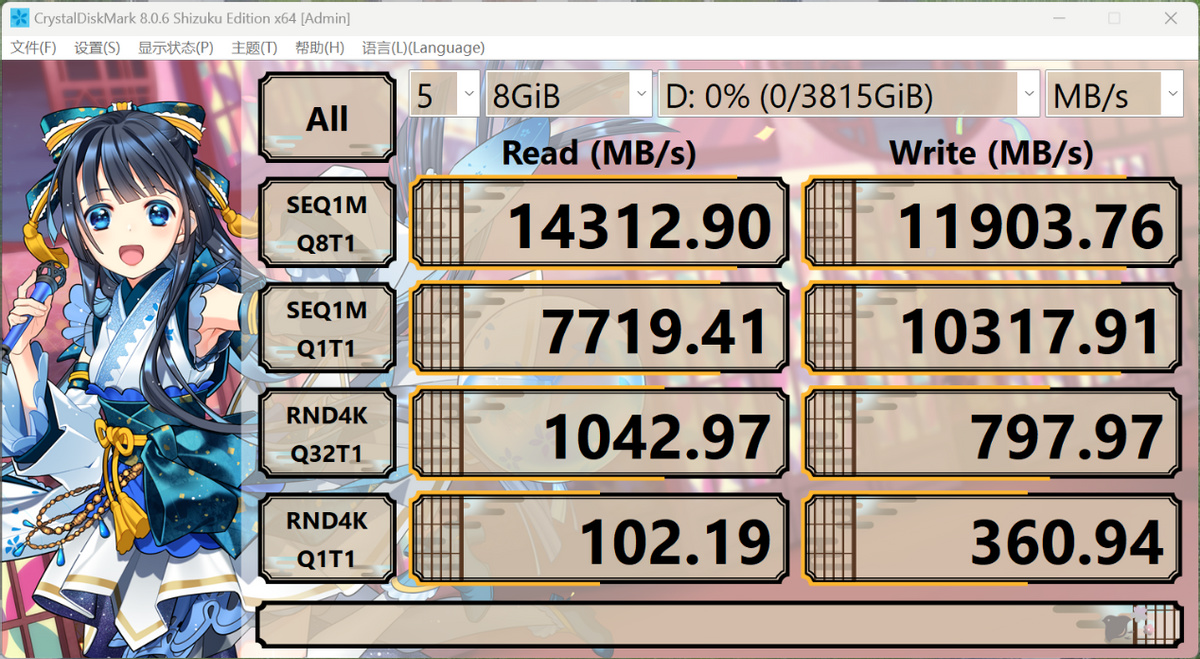 英特尔酷睿i7-14700KF+iGame Z790 Vulcan平台下,宏碁掠夺者GM9搭配CrystalDiskMark在8GB参数下的顺序读写速度分别是14312.9 MB/S和11903.76 MB/S。