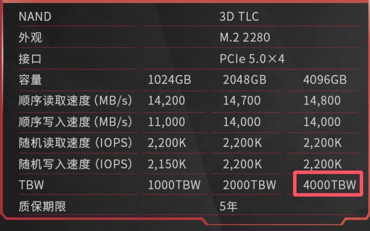 对于最大写入量的部分,直观上来看TBW是跟SSD所采用的闪存颗粒类型(NAND类型)有直接关系,采用不同颗粒的4TB PCIe 5.0 SSD,有的产品标注是2400TBW,有些则是高达4000TBW,问题是我们普通用户不可能为了测试这个TBW是否虚标而进行测试,所以目前我是将TBW作为选购参考依据而不是决定性依据,与其看标注的TBW数据还不入深入了解所用存储颗粒。