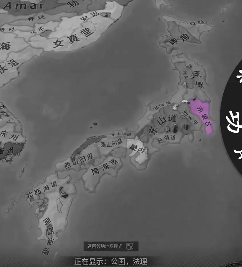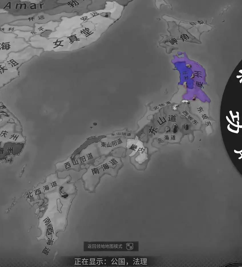 其四,由於遊戲中帝國法理的劃分,奧州與出羽這一隸屬於阿穆爾帝國的法理則單獨區劃開來,並沒有按照歷史歸爲東山道。