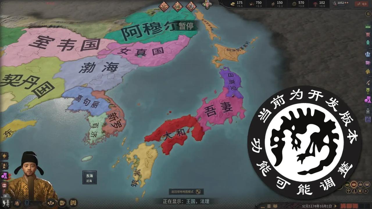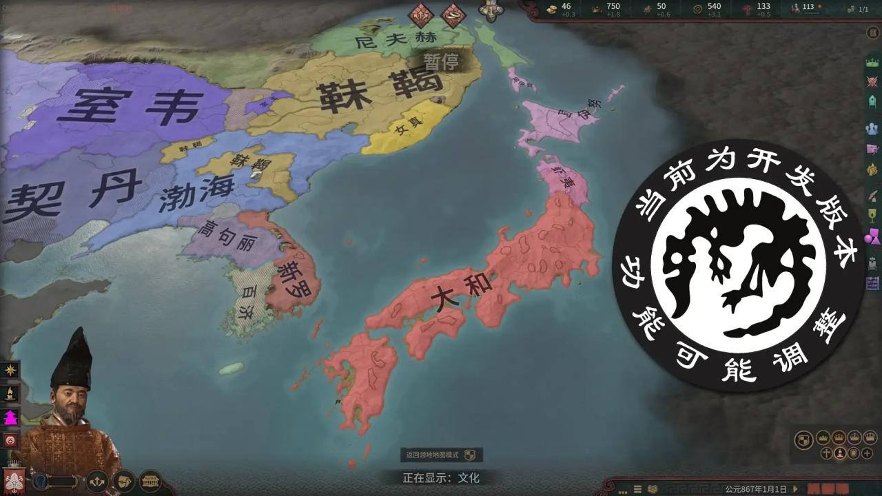 最後是文化地圖。如圖所示,日本的大和文化基本統一,半島後三國的文化則尚未統一爲高麗文化,遊戲中1066年才形成。