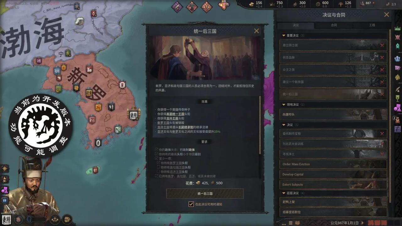 統一後三國決議需要擁有至少一個相關王國頭銜,並且統治整個半島。該決議會摧毀舊的王國頭銜,並創建一個帝國級的統一王國頭銜。不同的文化有着不同的命名,比方說三韓、高麗。