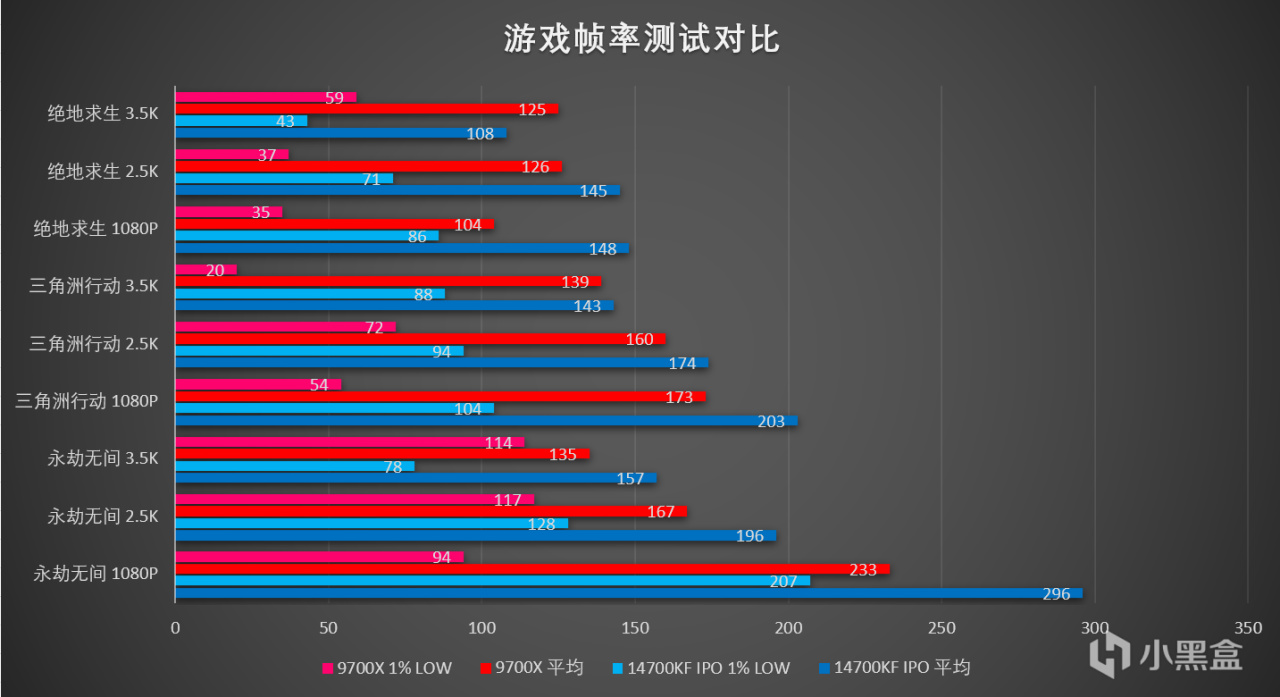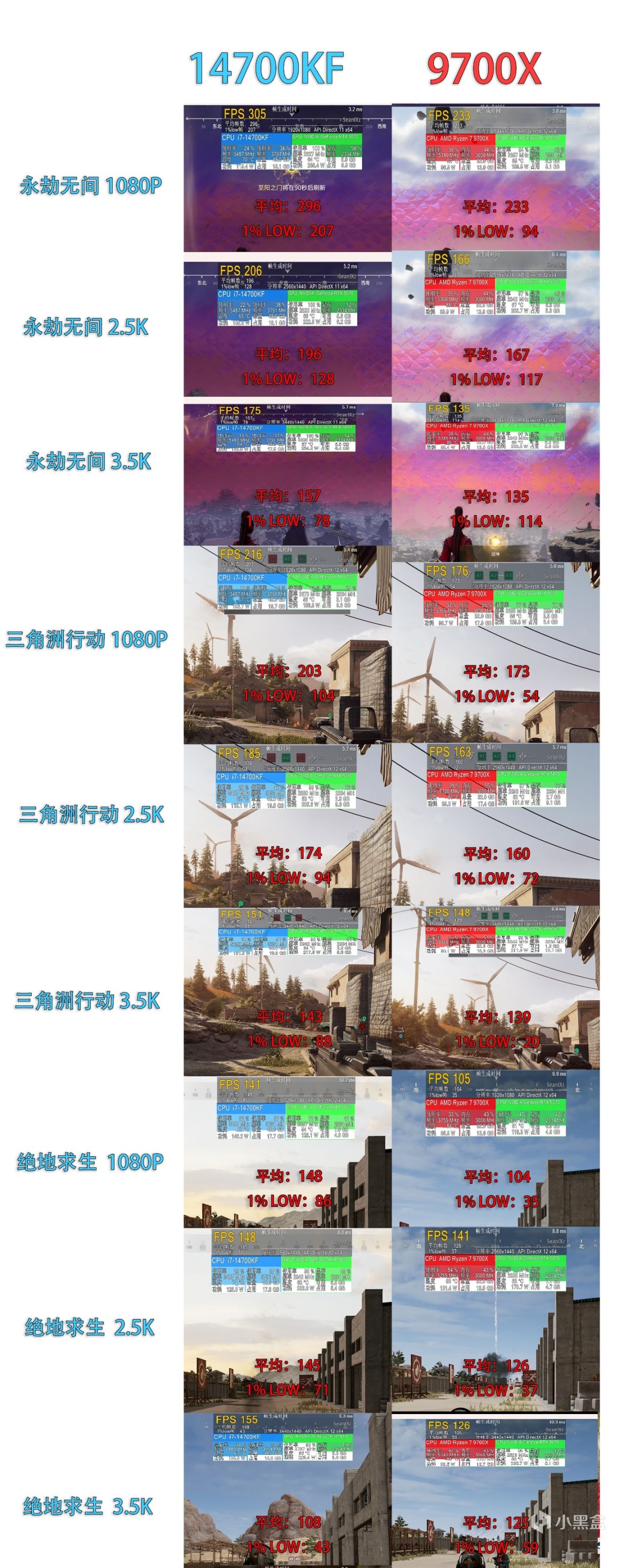 其它遊戲和檔位部分14700KF IPO調優的表現更好,尤其是三角洲行動3.5K檔位1%LOW幀(88幀)比9700X(20幀)高出幾倍,9700X 1%LOW幀低於20已經有明顯的卡頓感了,顯然高分辨率下某些場景9700X還是些喫力的,U似乎拉了一點後退。