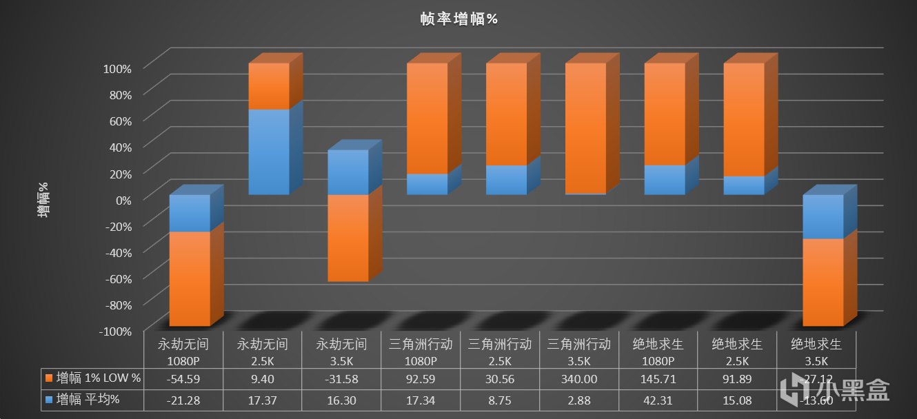 永劫無間在1080P/3.5K與絕地求生3.5K分辨率下9700X佔優1%LOW幀,低分辨率下低時序內存有很大的延遲優勢,流暢度表現更好。